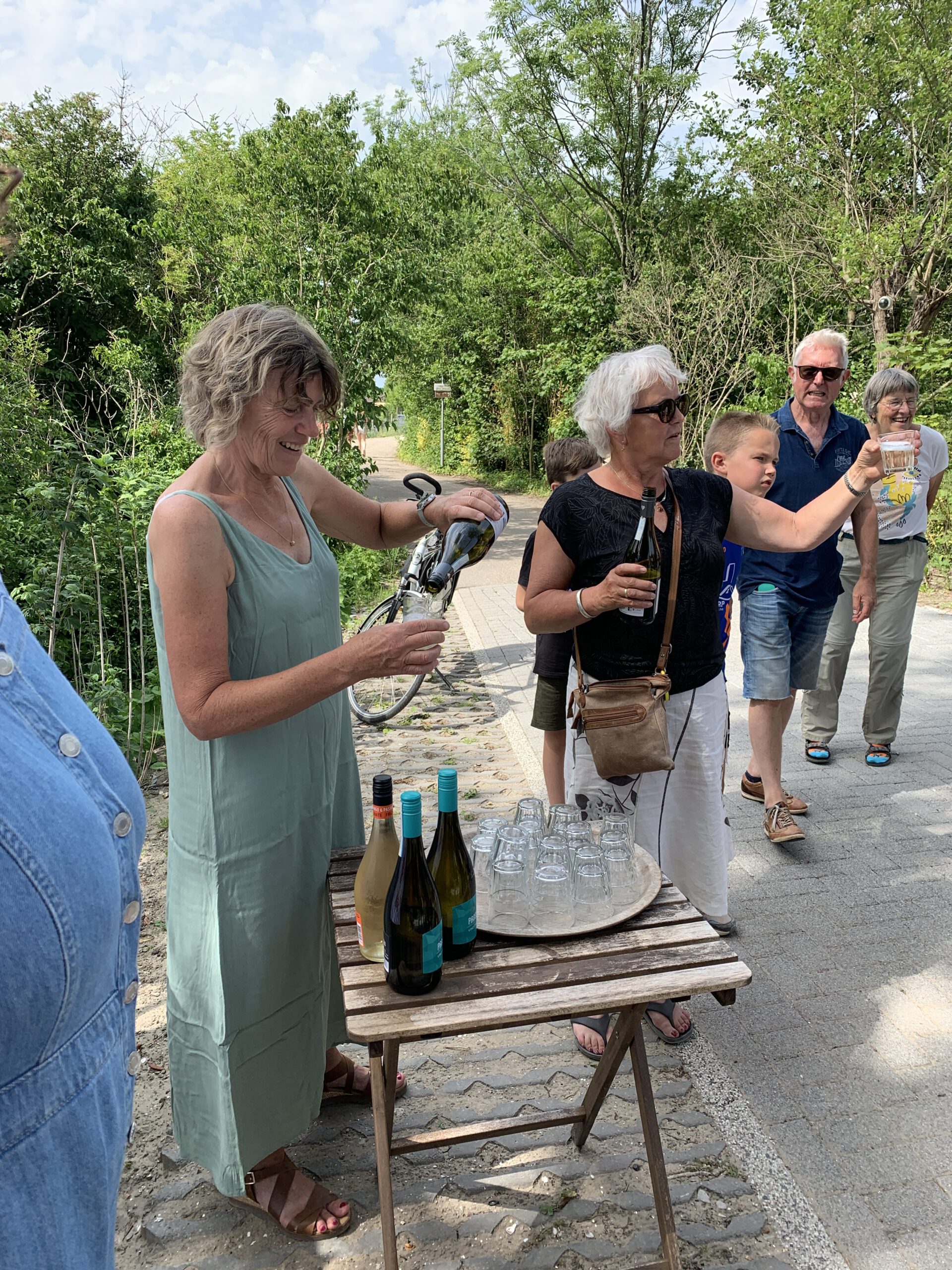 De officiële handeling van het lint doorknippen werd uitgevoerd door Ivonne en Mathilde. En dat was ook het moment om de bubbels in te schenken en met met elkaar te proosten op alles wat er was bereikt en wat er nog gaat komen met de vereniging.